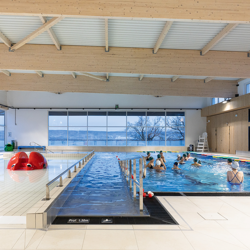 À Saint-Just Saint-Rambert (42), la piscine Petit Bois a rouvert ses portes mi-décembre 2025, après deux années de travaux. Construite en 1976, sur le modèle ‘caneton’, elle était très consommatrice en termes d’énergie et d’eau (173 L/baigneur/jour !). “Une étude a démontré que le territoire avait besoin de deux piscines supplémentaires, à ses deux extrémités, tout en précisant qu’il fallait prioriser la rénovation de la Piscine Petit Bois située dans une ville de plus de 15 000 habitants avec une zone de chalandise importante. Nous avons décidé de tout démolir (les matières pouvant être réutilisées ont été déduites de la facture de démolition) et construire un nouvel établissement sur le même site : ce dernier étant bien placé au sein de la ville (accès transport en commun), avec une belle vue sur les Monts du Forez. De plus, cette décision permettait de ne pas artificialiser de zone supplémentaire”, argumente Jean-Marc Grange, conseiller communautaire délégué de Loire Forez Agglomération. Le comité de pilotage mis en place a déterminé trois priorités pour le nouvel établissement :